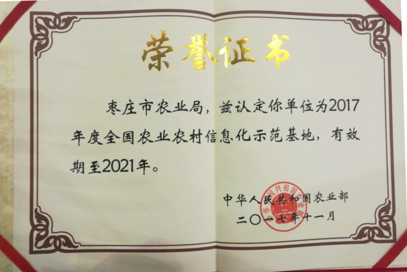 枣庄市农业局被授予“全国农业农村信息化示范基地”