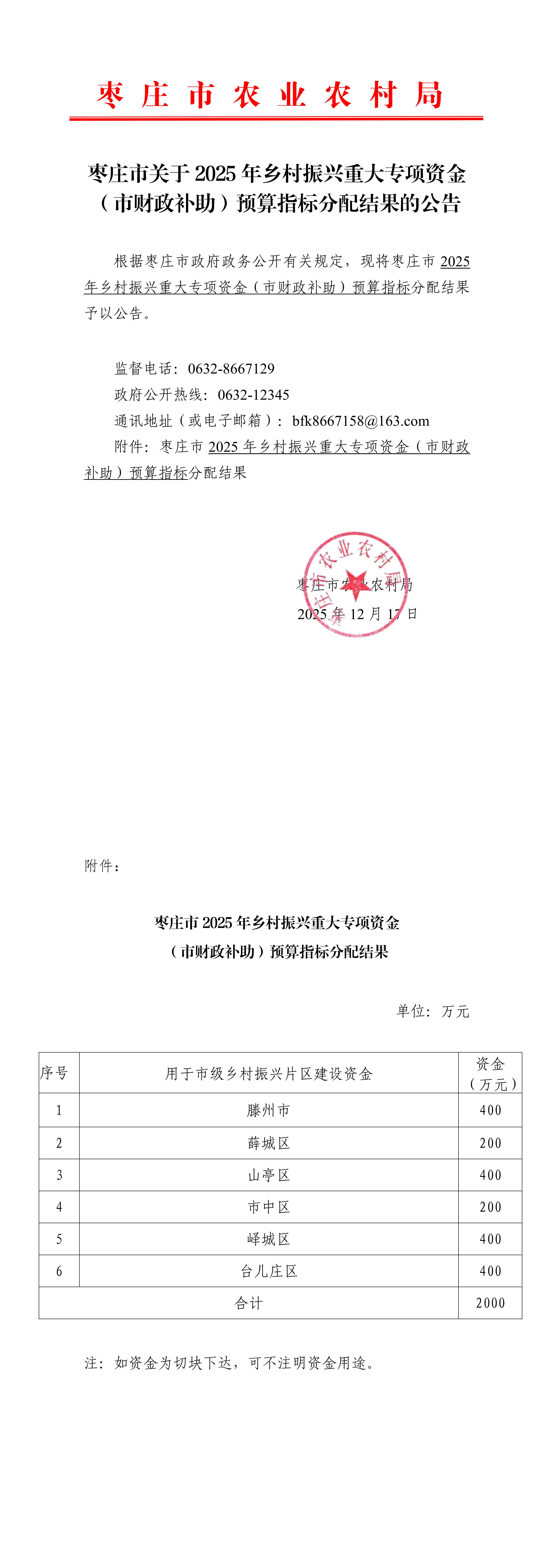 枣庄市关于2025年乡村振兴重大专项资金(市财政补助)预算指标分配结果的公告